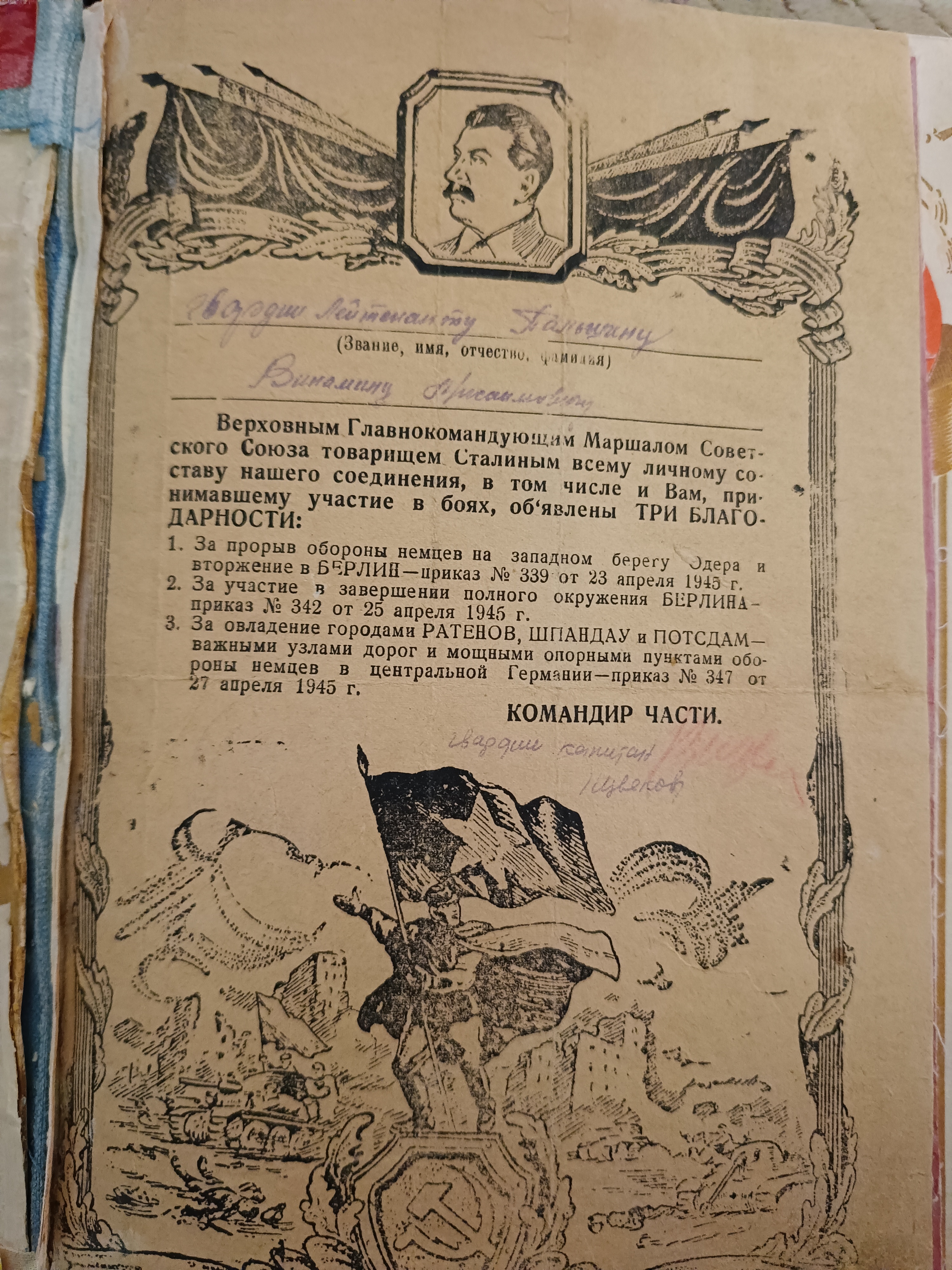 Затем последовали бои на Белорусском фронте, где он вновь был отмечен уже вторым орденом Красной Звезды за освобождение Литвы и Латвии. Особенно бережно хранил солдат Джабиров пожелтевший клочок бумаги, на котором было написано: «Штаб 69-й Легкой артиллерийской бригады. Сержанту Джабирову Саиду приказом Верховного Главнокомандующего, Маршала Советского Союза тов. Сталина от 13 октября 1944 г. за отличные боевые действия против немецко-фашистских захватчиков при освобождении Советской Латвии и гор. Рига объявлена благодарность». Благодарность Верховного Главнокомандующего была действительно большой наградой для каждого солдата.