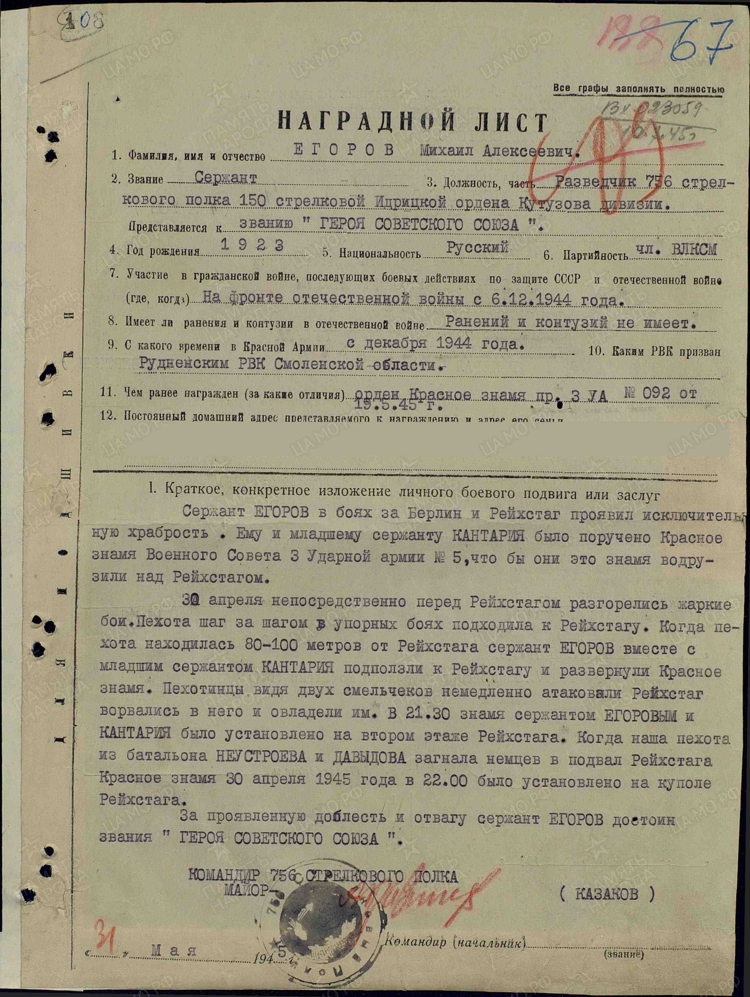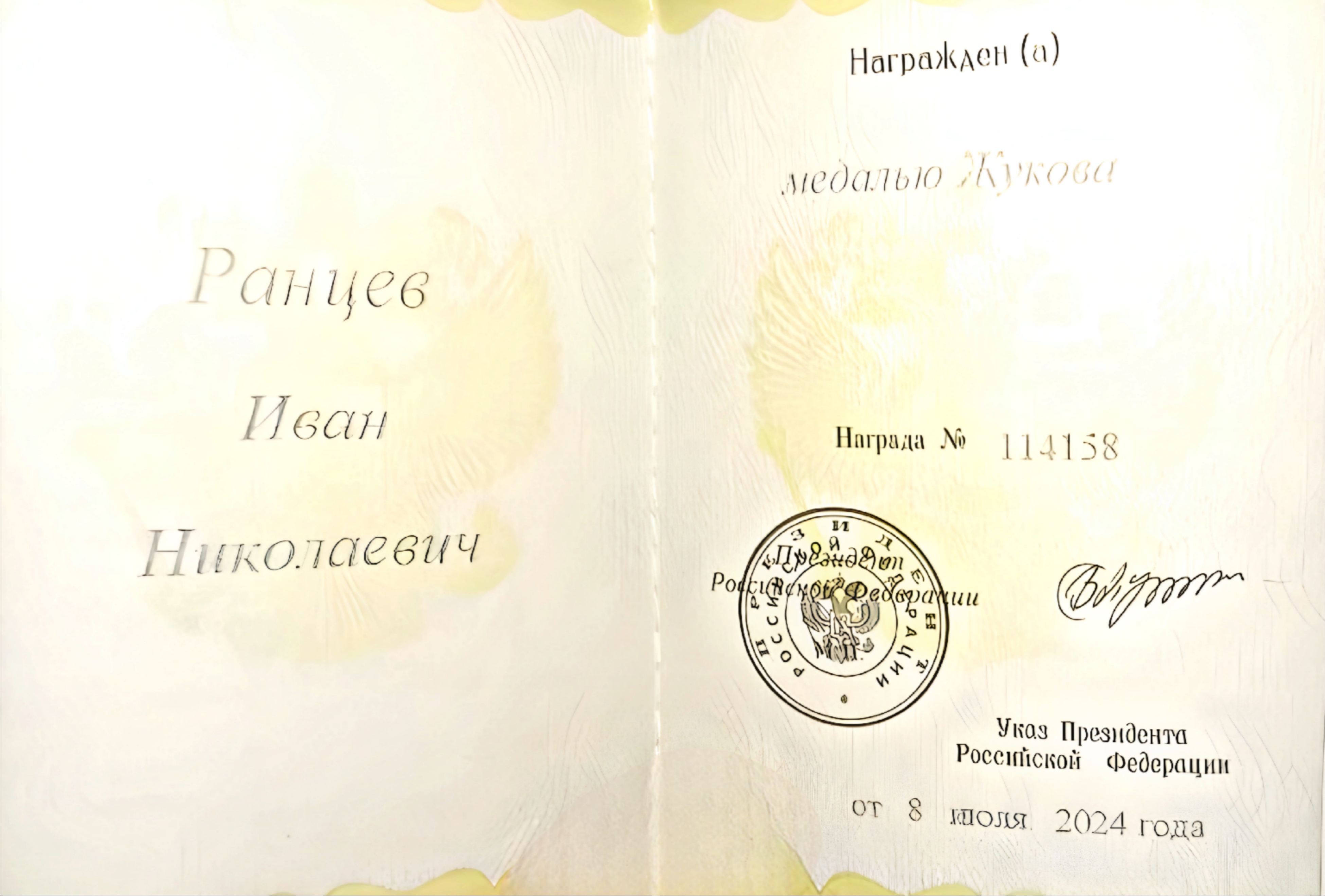 Представлен к наградам: медаль Суворова, медаль «За отвагу».
