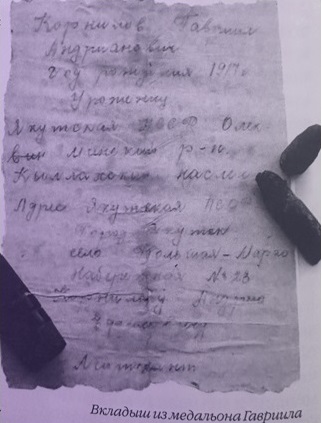 Эта маленькая пожелтевшая записка, найденная в медальоне, для нас, рода Корниловых, самый дорогой и бесценный документ. Она рассказывает о без вести пропавшем воине, о моем дяде – Гаврииле Андриановиче Корнилове, павшем смертью храбрых за нашу Родину в первые годы Великой Отечественной войны.