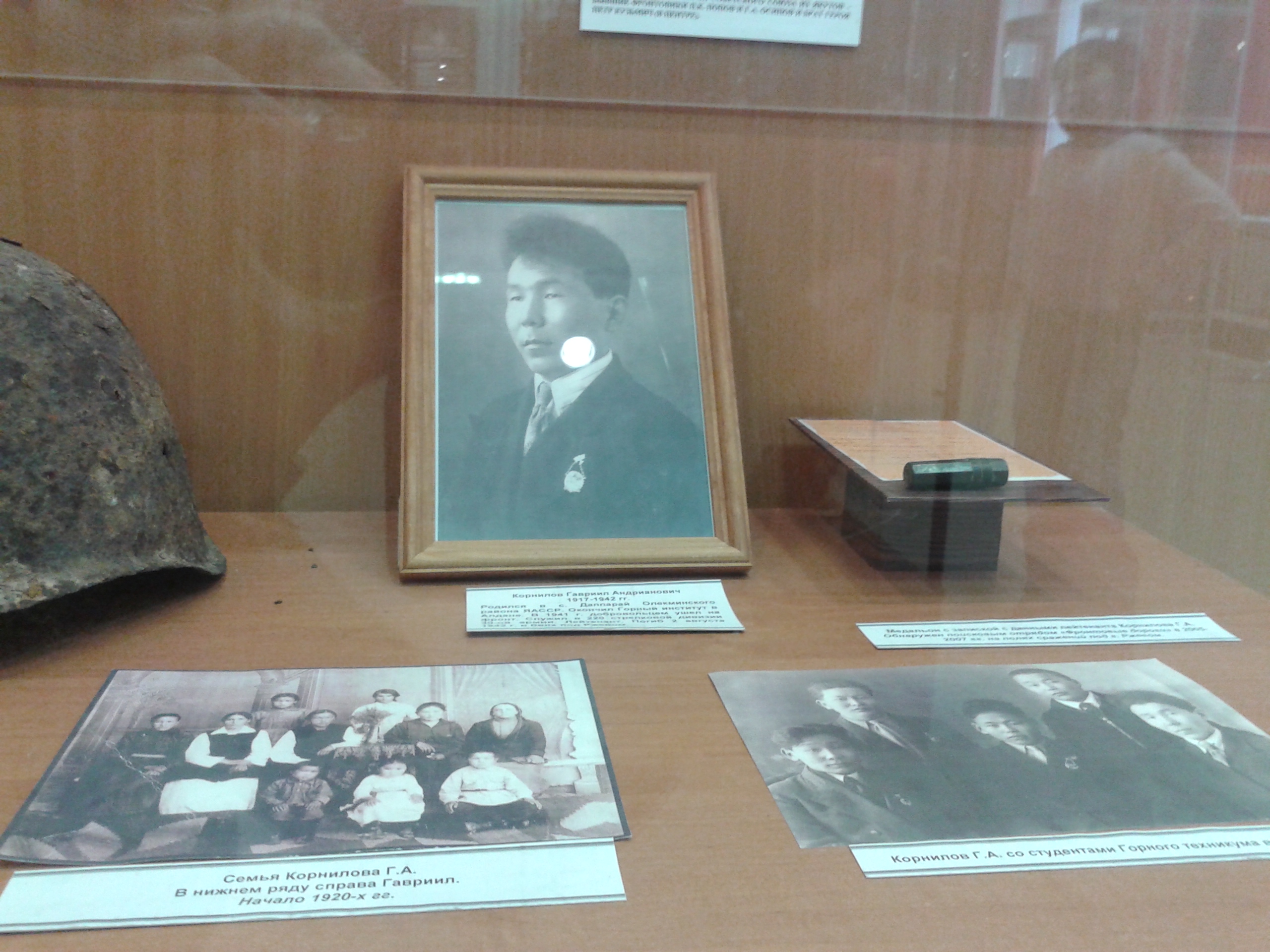 Мы посетили Якутский государственный объединенный музей истории и культуры народов Севера им. Емельяна Ярославского в г. Якутске. Солдатский медальон, каска, кружка, лопата, фляга, солдатский котелок Корнилова Гавриила Андриановича, найденные под Ржевом, находятся сейчас в этом музее.