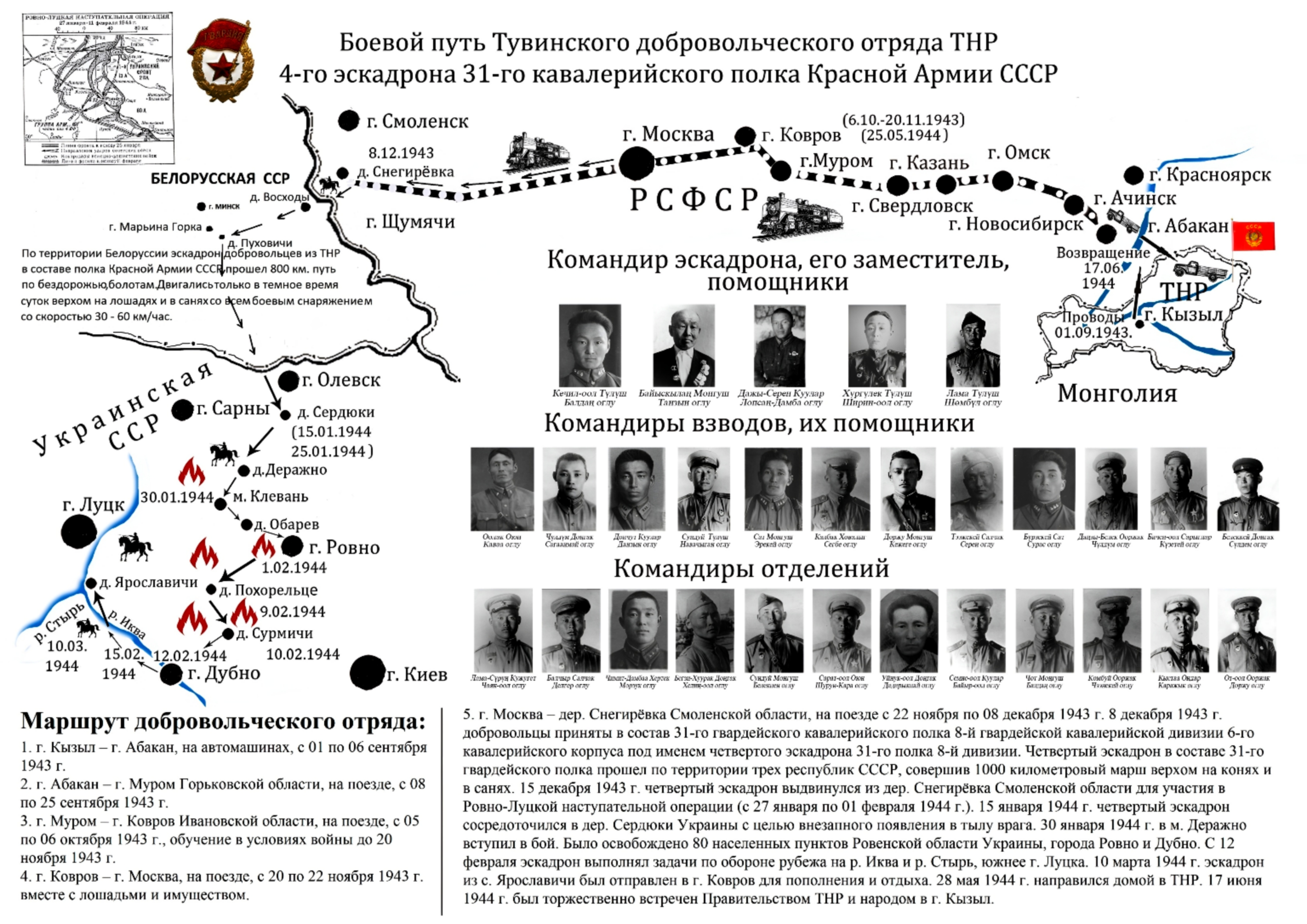 Первая группа тувинцев, состоявшая из 11 человек, была направлена в 25-й отдельный танковый полк. Вслед за ними, 1 сентября 1943 года, в Кызыле прошли торжественные проводы добровольческого эскадрона, в который вошли 208 человек, включая 10 девушек-санитарок. Пройдя подготовку в Муроме и Коврове, тувинцы в ноябре 1943 года показали свою боевую готовность и отправились на фронт.